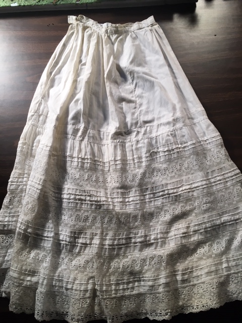 But what would Mrs. J.C. Ferren have sold in her store? As the only millinery and “fancy goods shop” in Freedom, she would have sold a variety of women’s hats, clothing, shoes, accessories, stationery, personal items and children’s goods. Women of the late 19th century wore many layers of clothing, including petticoats and/or a chemise. A chemise was a long slip and undershirt combined. A chemise might have handmade lace and embroidery on the front, but it was worn underneath all the clothes, so no one would see it.